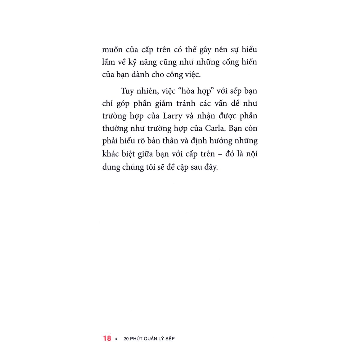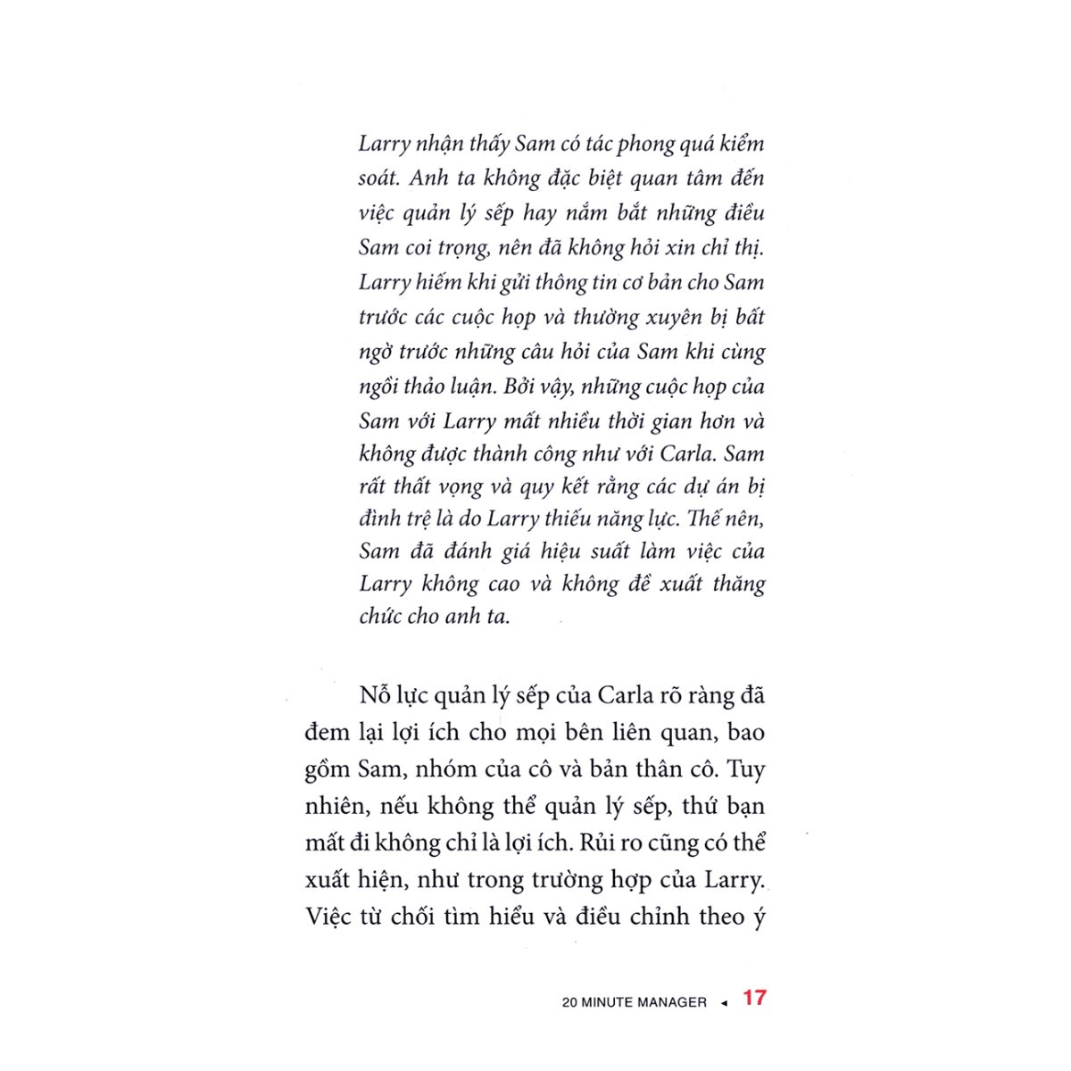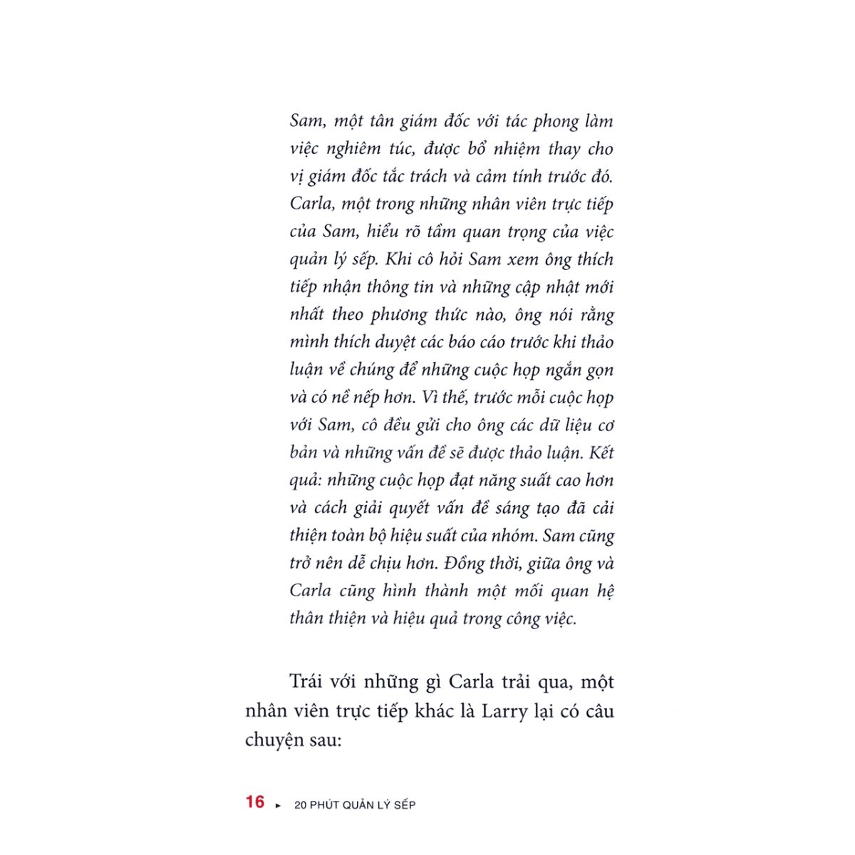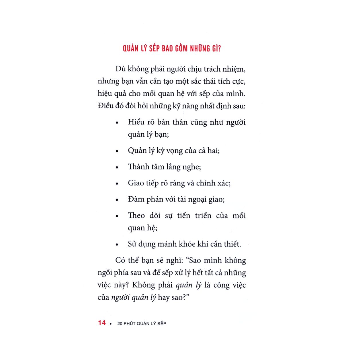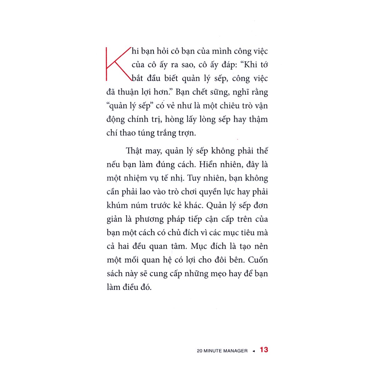 Sếp là người đóng vai trò rất quan trọng trong sự nghiệp của bạn. Bạn phải làm gì để vừa hướng mối quan hệ mong manh, quan trọng và thuần chuyên môn này theo ý mình, vừa không sa vào những chiêu trò chính trị hay làm mất đi bản ngã. 20 phút quản lý sếp sẽ mang đến cho bạn những lời khuyên hữu ích.