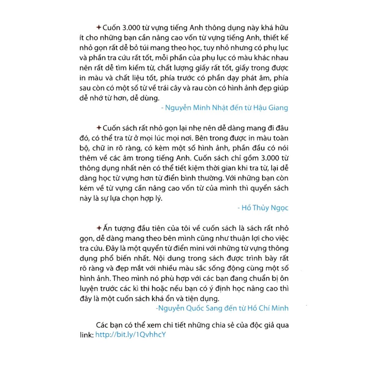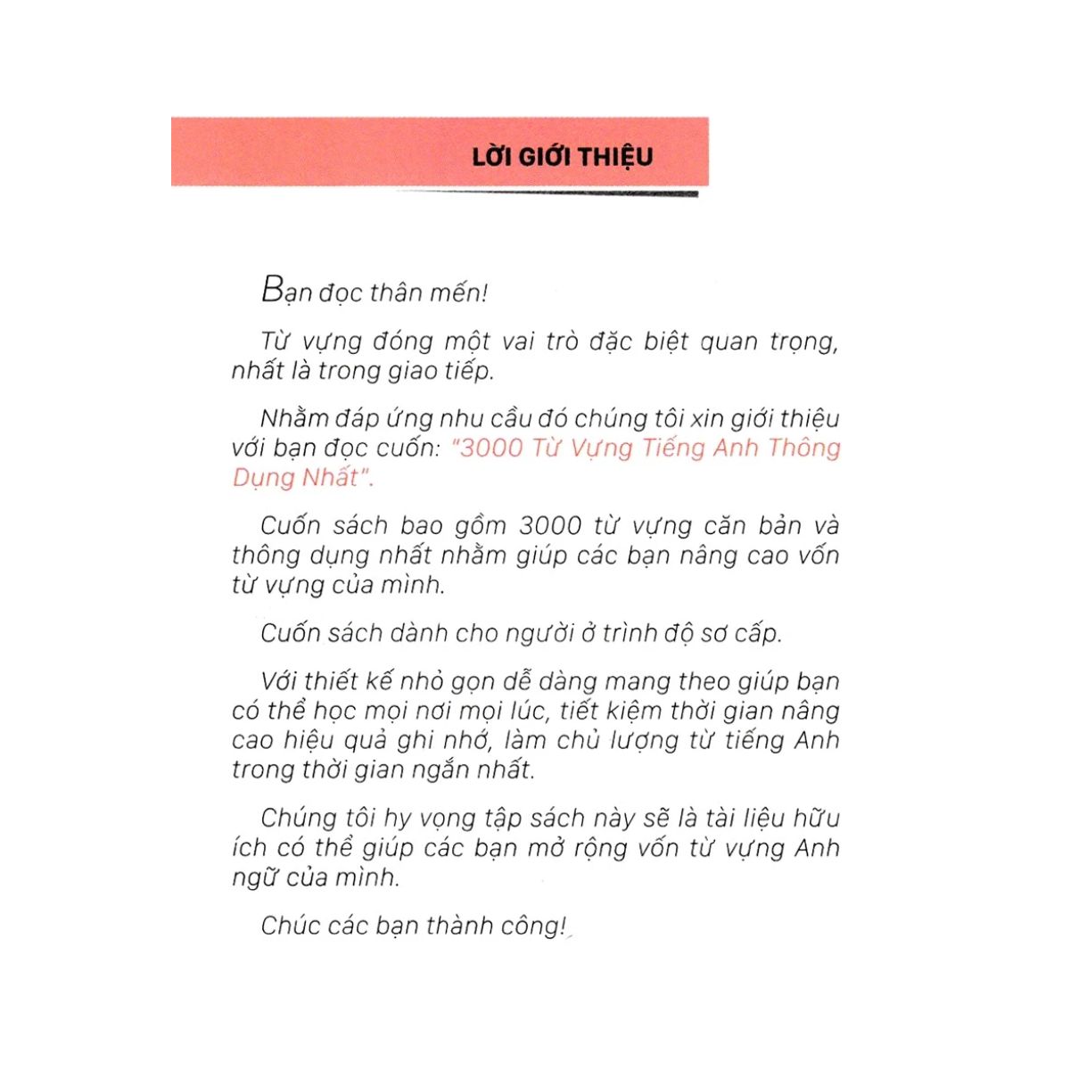 Từ vựng đóng một vai trò đặc biệt quan trọng, nhất là trong giao tiếp. Nhằm đáp ứng nhu cầu đó chúng tôi xin giới thiệu với bạn đọc cuốn 3000 Từ vựng Tiếng Anh thông dụng nhất. Cuốn sách bao gồm 3000 từ vựng căn bản và thông dụng nhất nhằm giúp các bạn nâng cao vốn từ vựng của mình.