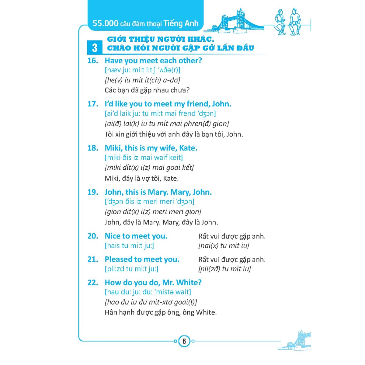 Cuốn sách “55.000 Câu Đàm Thoại Tiếng Anh” gồm 28 bài. Mỗi bài là các mẫu câu cơ bản có giải thích cách sử dụng mẫu câu rõ ràng.
