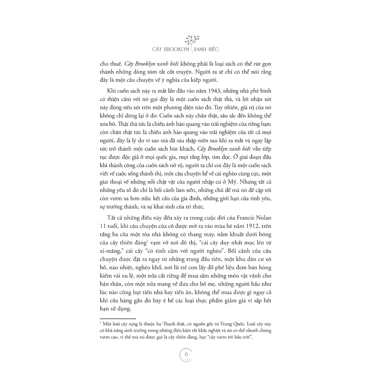 Giống như cái tên của nó, cuốn sách kể về một loài cây đặc biệt – loài cây duy nhất có thể mọc lên mạnh mẽ giữa lòng đô thị khắc nghiệt, len lỏi qua những kẽ nứt của bê tông để vươn tới bầu trời. Đó cũng chính là hình ảnh ẩn dụ cho Francie Nolan, cô bé lớn lên trong khu ổ chuột Williamsburg, Brooklyn.