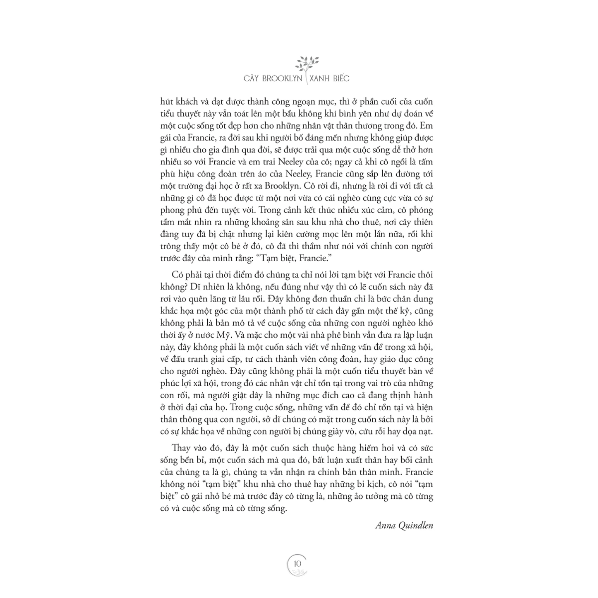 Sự khẳng định cá nhân: Mỗi con người là một sự tổng hòa độc nhất. Francie là những cuốn sách cô đọc, là bông hoa cô ngắm, là tiếng khóc của mẹ và nỗi xấu hổ của cha… nhưng cô cũng là chính cô, với một linh hồn khác biệt hoàn toàn với bất kỳ ai khác.