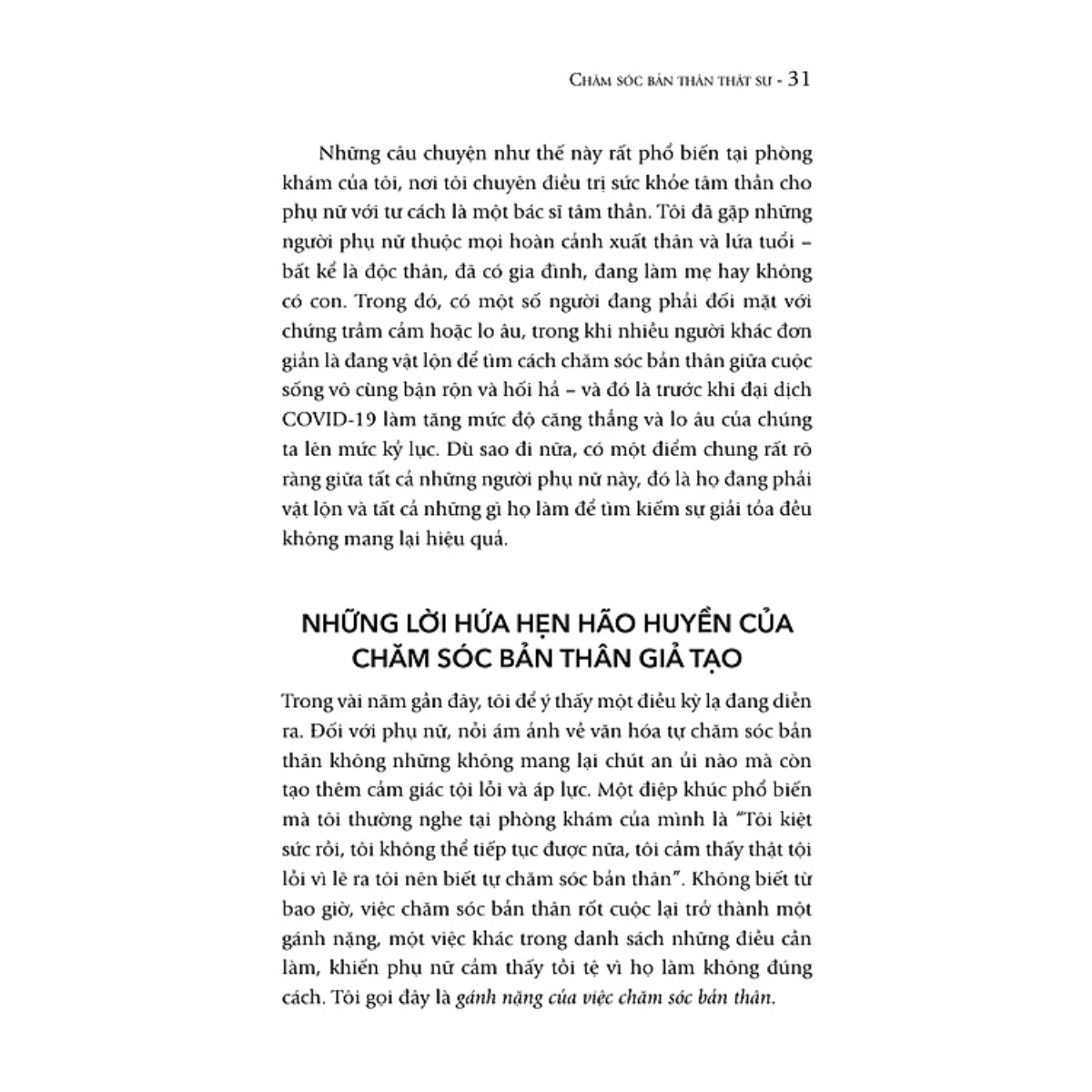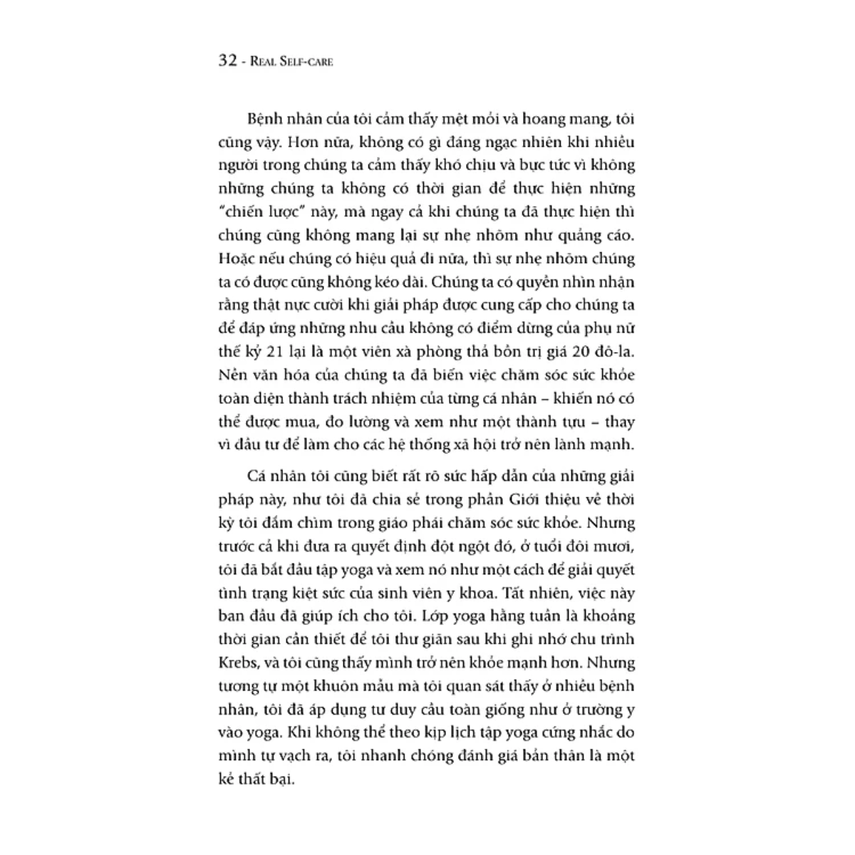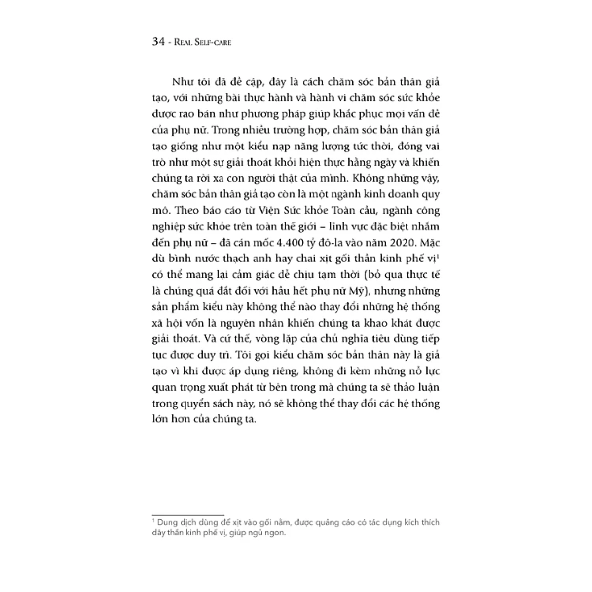 Tác giả chỉ ra rằng, phần lớn những gì chúng ta gọi là “self-care” hiện nay thực chất là sản phẩm của nền văn hóa tiêu thụ. Chúng khai thác sự bất an của chúng ta, khiến ta tin rằng mua thêm một món đồ hay thực hiện một nghi thức bề nổi sẽ giải quyết được mọi vấn đề. Thực tế, chúng chỉ che đậy sự kiệt sức và khiến ta áp lực hơn khi cố chạy theo các tiêu chuẩn xã hội.