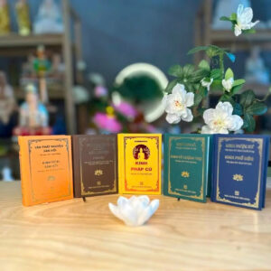 Bộ 5 cuốn kinh mini bìa cứng (Địa tạng + Sám Hối + Pháp Cú + Vô Lượng Thọ + Phổ Môn – tặng vòng & lá bồ đề)