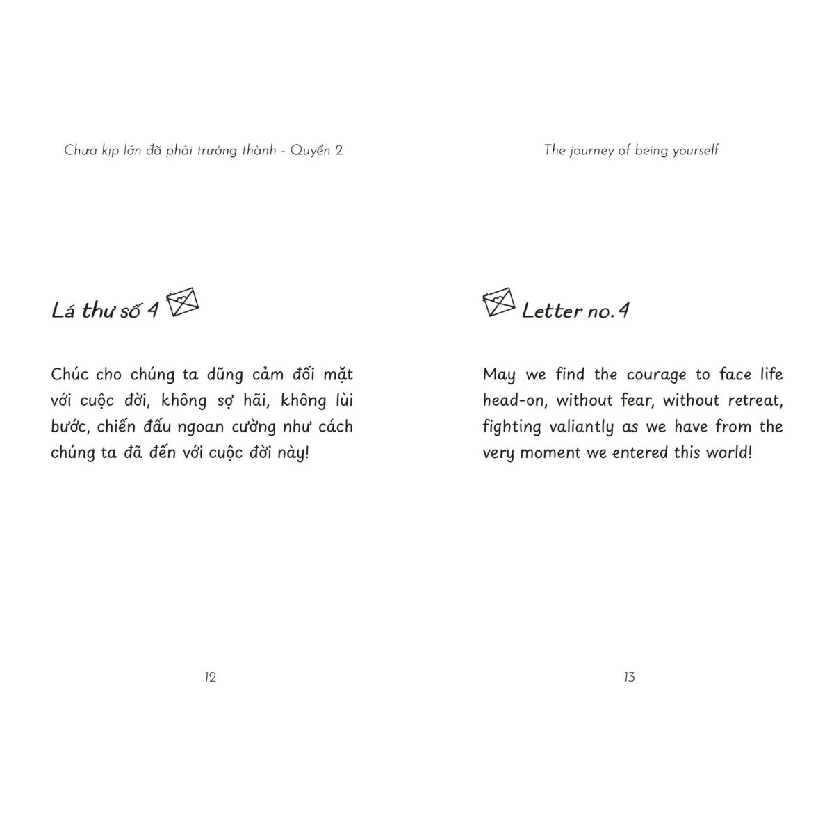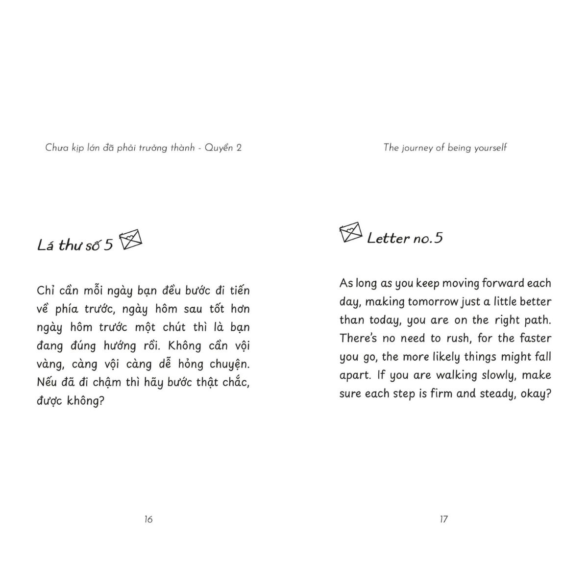 Cuốn sách mang đến những lá thư tâm tình nhẹ nhàng, dành cho những ai đang cảm thấy lạc lõng giữa hành trình trưởng thành. Không ai muốn lớn lên khi chưa sẵn sàng, nhưng thử thách là điều giúp ta mạnh mẽ, kiên nhẫn và dịu dàng hơn với chính mình.